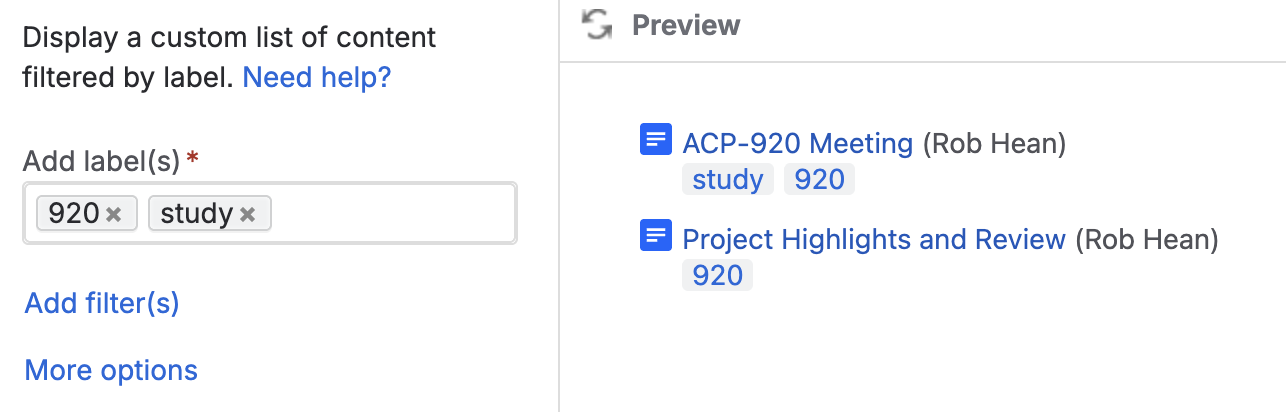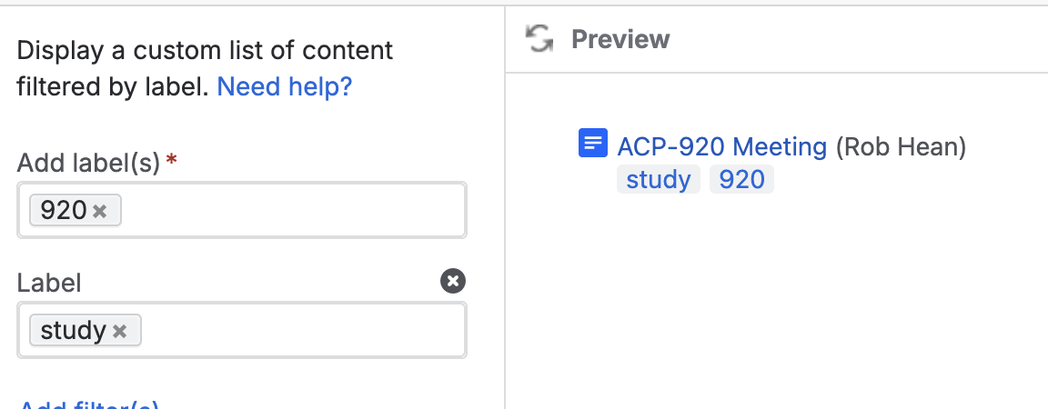 Note that most macros will treat one “Labels” filter as an “OR” statement. For example, if I put both the “920” and “study” macros in the labels field, it will give me pages with EITHER labels.