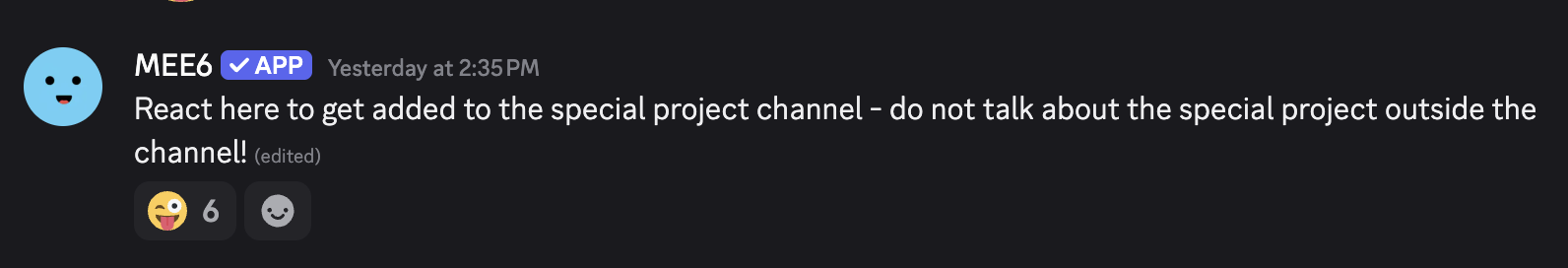 There is a bot I use in Discord called MEE6 (pronounced Me-seeks) which automates tasks and helps manage things. One thing MEE6 can do is automate group membership based on emoji reactions to messages. So I quickly setup a message in the channel asking if folks wanted to help with a "special project". All they had to do was react to it and they'd get access to the channel