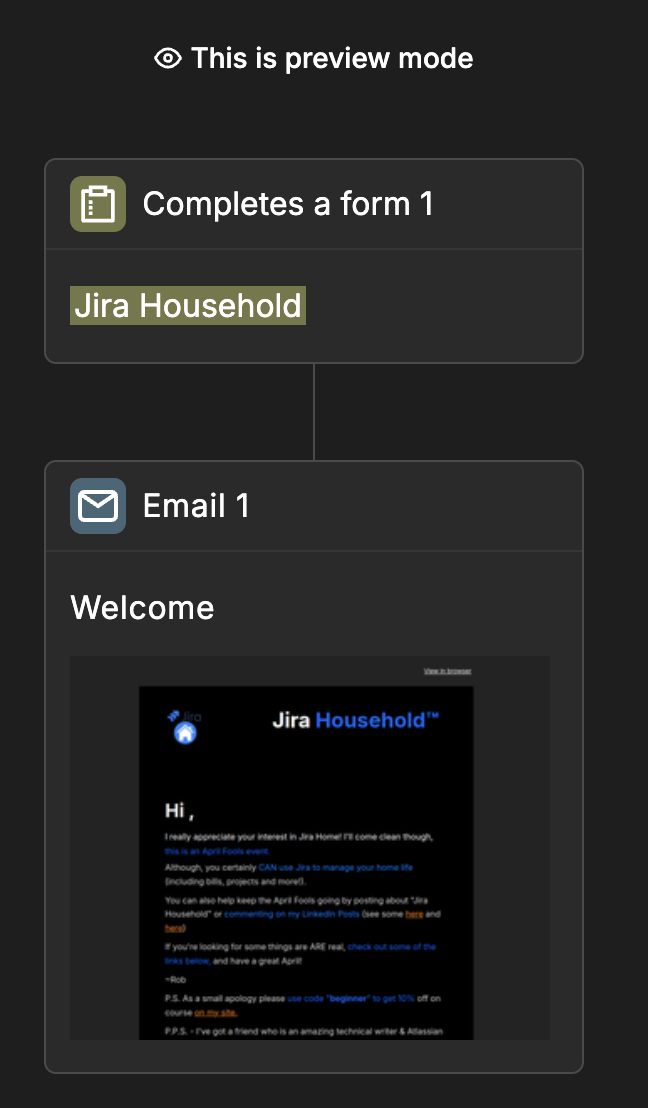 The email is automatically sent whenever someone signs up for more Jira Household updates. This removes any need for me to monitor anything, and ensures a consistent "signup" experience for everyone. The email clearly explains it's an April Fools joke, and then goes to offer more information about my site and blog (and an apology coupon in case folks want one!).